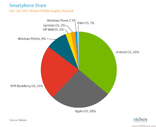 این در حالی است که 36% بازار آمریکا اندروید 26% این بازار در دست ای او اس و 23% BlackBerry و 9% از ویندوز موبایل اسفاده می کنند.و سیستم عامل های WebOS ,symbian ,Windows Phone 7 ,Palm سهم بسیار کمی در این بازار دارند.از علت هایی که سیمبیان سهم کمی داشته قدیمی بودن آن است.البته شایان ذکر است که سال ها بازار آمریکا در دست اپل بوده است در این آمار گفته شده است چون افراد در آمریکا از در آمد خوبی بر خور دارند افراد همیشه در همه حال رو به تکنولوژی های جدید می آورند.در واقع آزمایشگاه تکنولوژی است.اگر بالای 50% جواب بدهد در کل جهان این آمار بالا می رود.مثل سیمبیان در روزهای اول.علت دومی که ذکر شده است Google با همه شرکت ها تلاش گسترده ای برای همکاری داشته است.