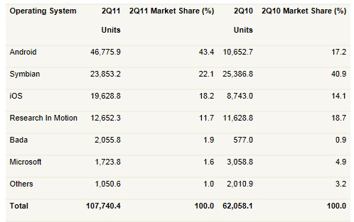 امروز تمامی آمارهای Q2 مشخص شد.آمارها گویایه آن است که در مارکت ها نوکیا با 22.8 درصد رتبه اول و سامسونگ با 16.3 درصد رتبه ی دوم را دارد.دربخش سیستم عامل اندروید با 43.4 درصد مقام اول و سیمبیان با 22.1 درصد مقام دوم را دارد.حال نکته جالب توجه این است در سیستم عامل ها iOS با 18.2 درصد مقام سوم در مارکت ها تنها با داشتن 4.6 درصد مقام چهارم را دارد.تمامی آمار ها به شرح زیر است: